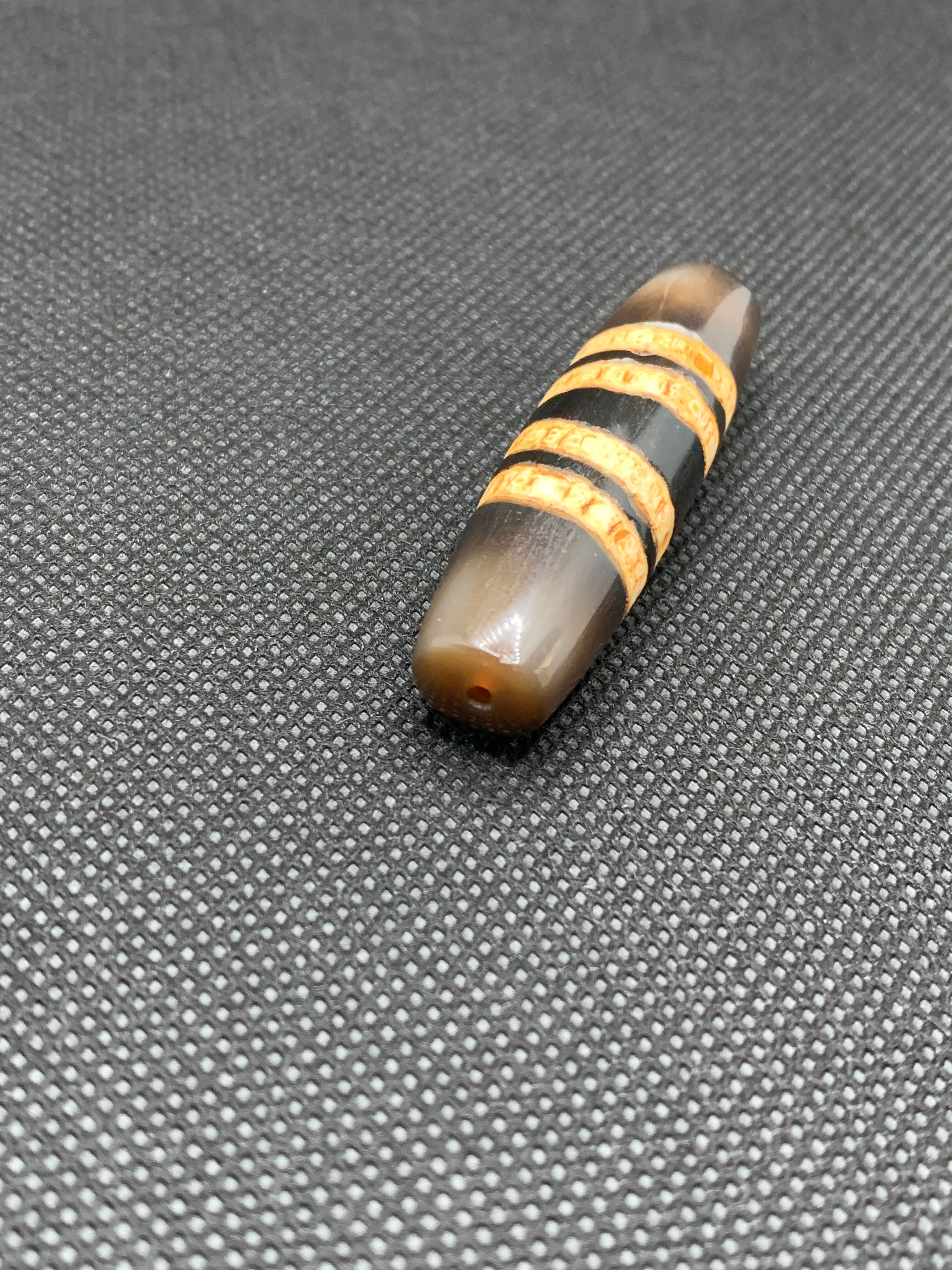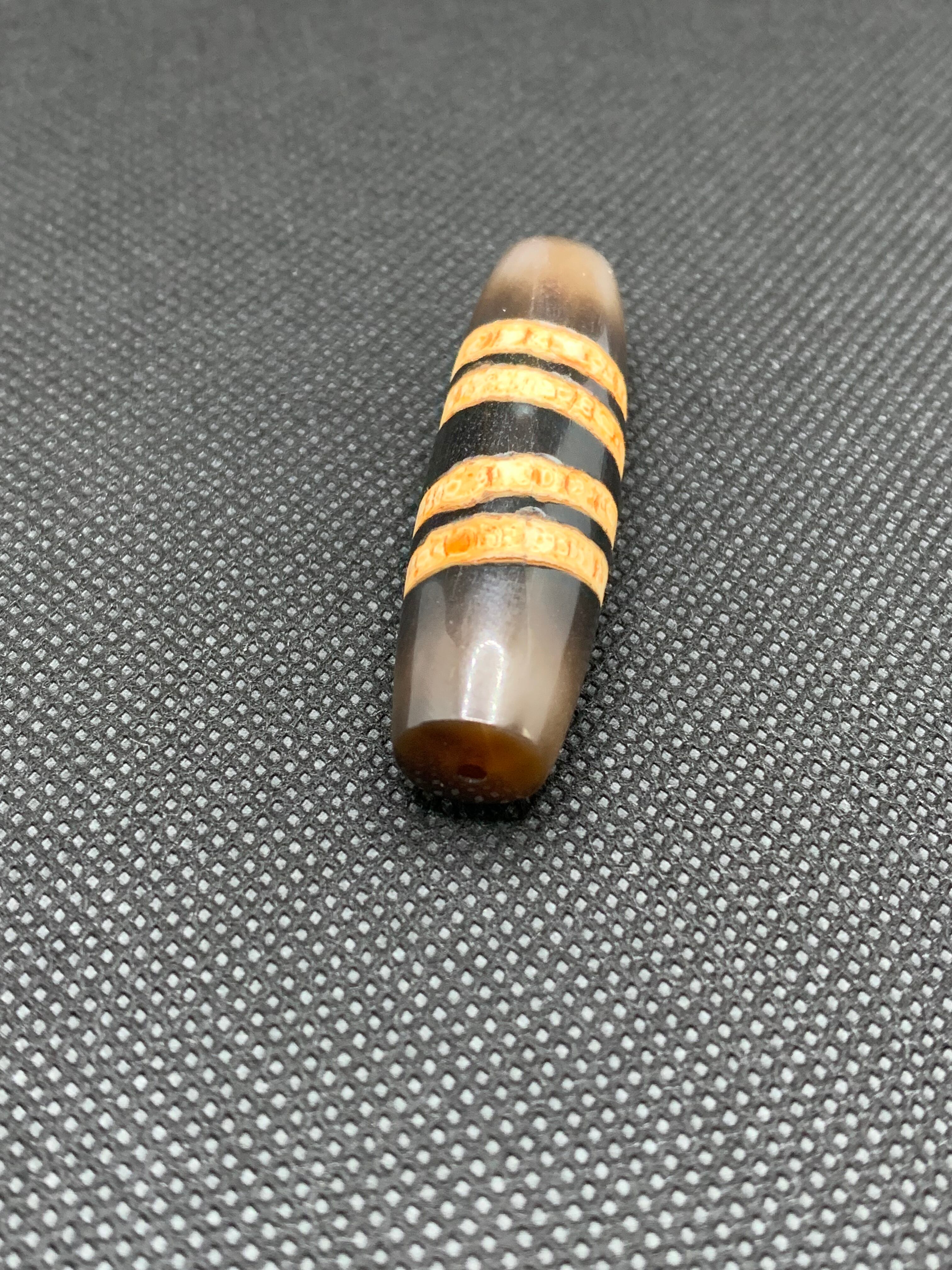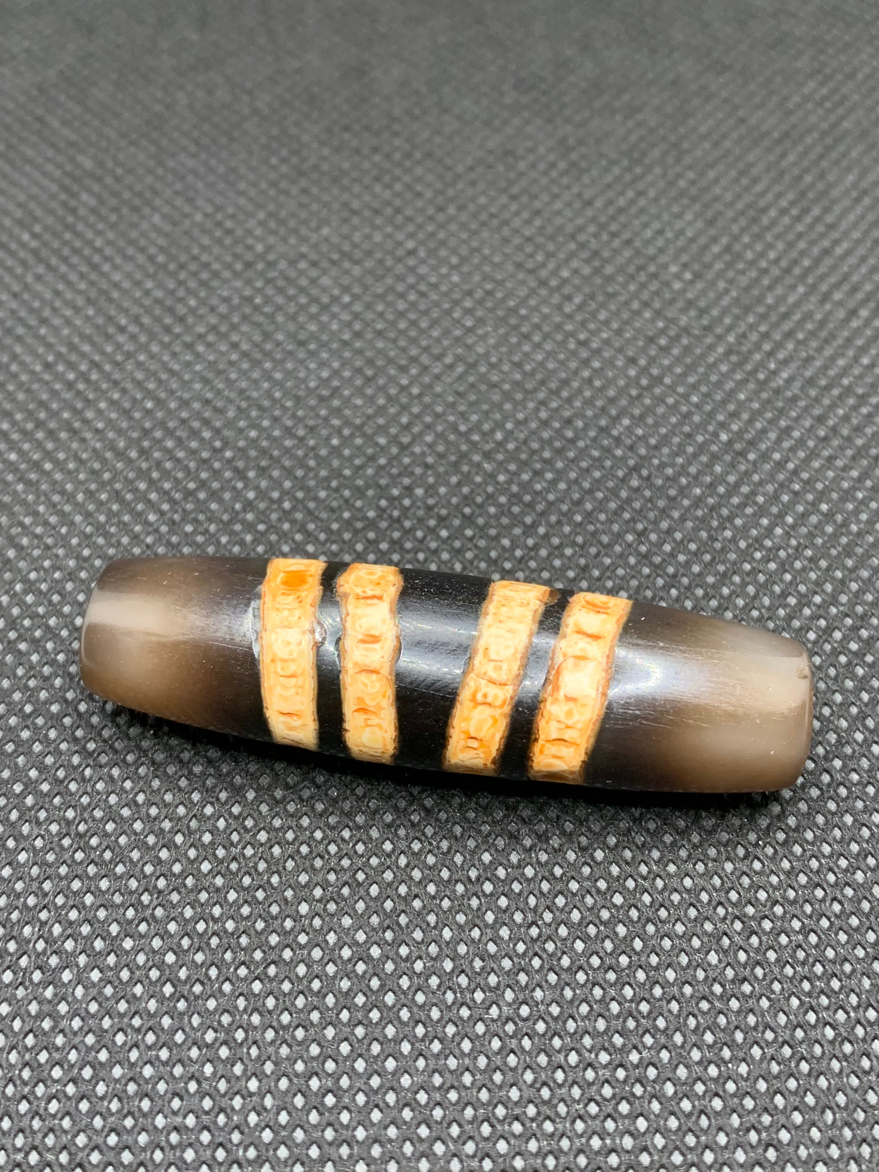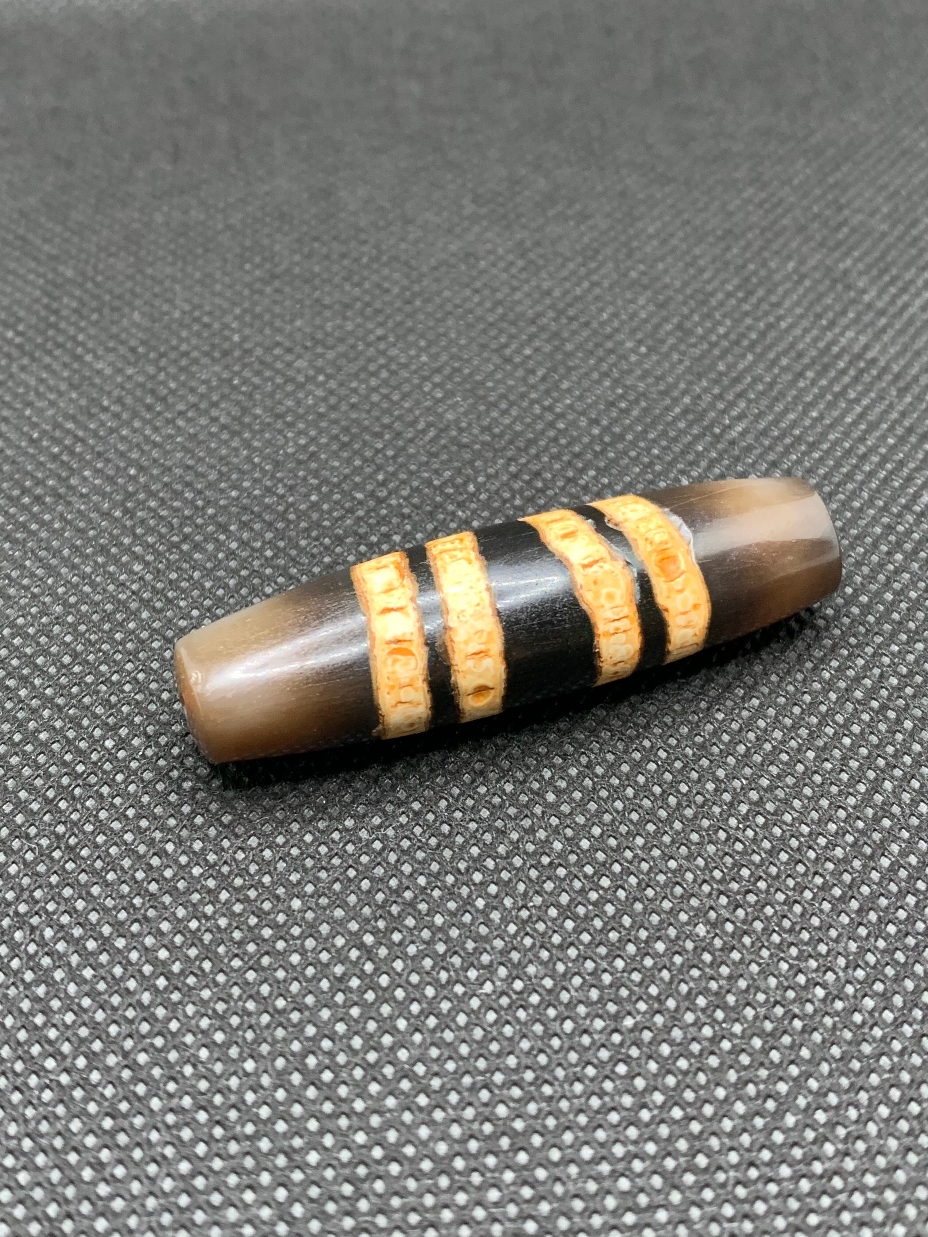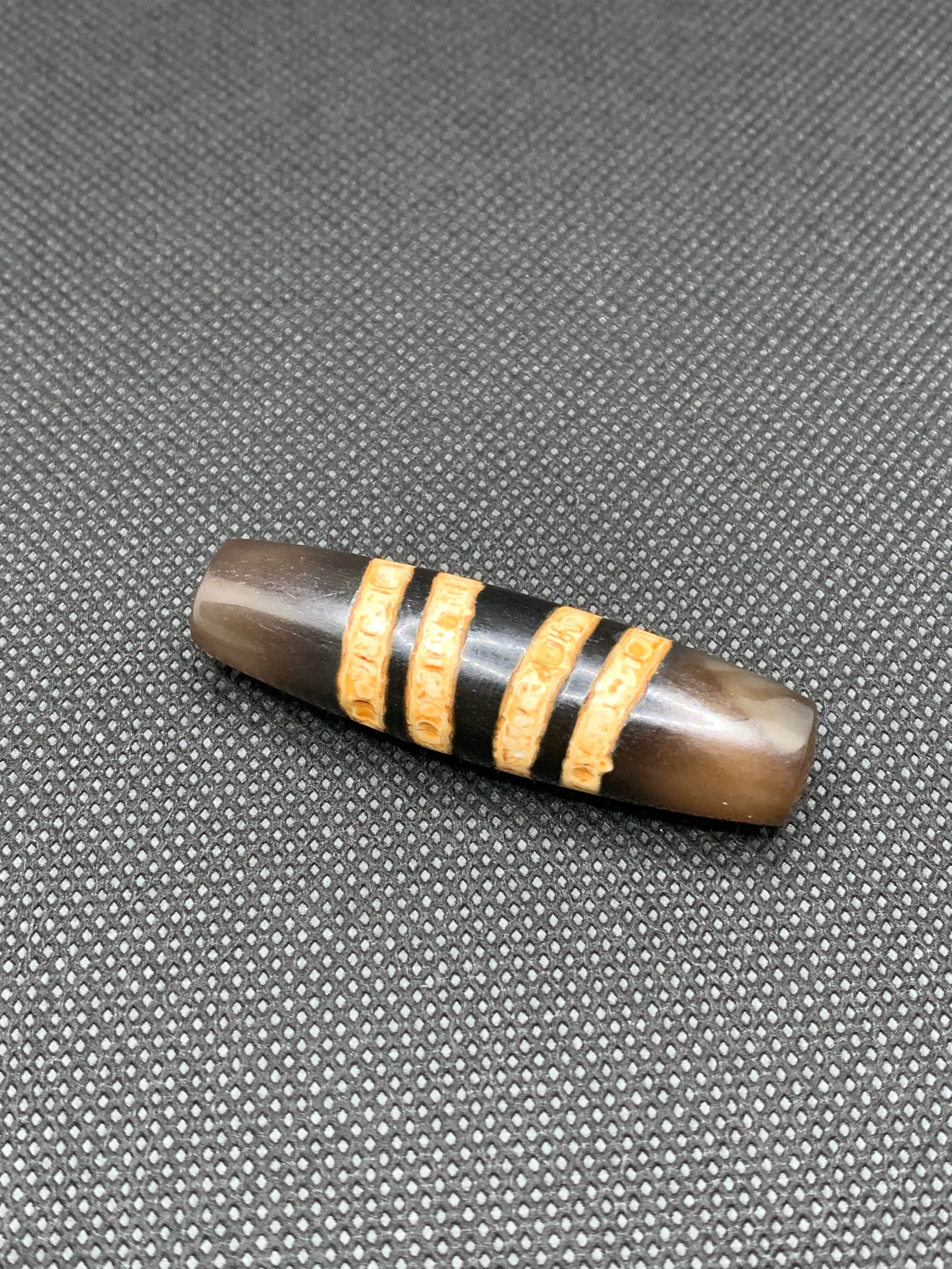 ネパールの七線天珠(7-Line Chung dZi)は、近年よく見られる図騰デザインの一つで、天珠(dZi)ファミリーに属するとされています。ネパール文化においては、財運と智慧の象徴を兼ね備えた、深い意味を持つ護符の珠として親しまれています。